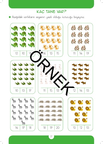 KAÇ TANE VAR? Aşağıdaki varlıkların sayısının yazılı olduğu kutucuğu boyayınız. 13 16 11 15 12 10 ÖRNEK 14 19 18 10 13 17 11 15 13 12 14 13 14 17 18 18 19 20 10 12 13 31