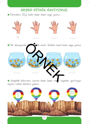 Her akvaryumda 5 tane balık vardır. Balıkları beşer beşer sayıp yazınız.