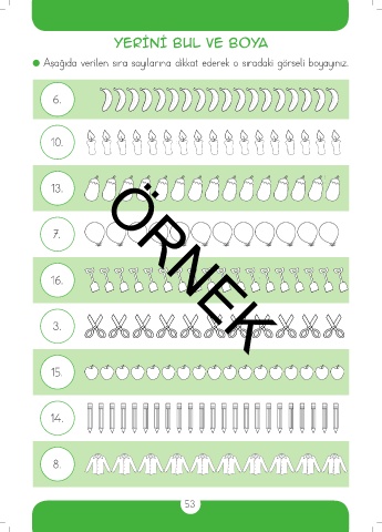 YERİNİ BUL VE BOYA Aşağıda verilen sıra sayılarına dikkat ederek o sıradaki görseli boyayınız. 6. 10. 13. 7. 16. ÖRNEK 3. 15. 14. 8. 53