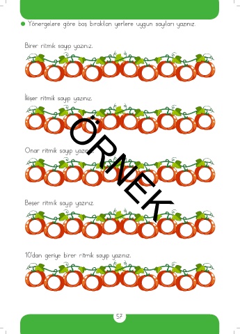 Yönergelere göre boş bırakılan yerlere uygun sayıları yazınız. Birer ritmik sayıp yazınız. İkişer ritmik sayıp yazınız. Onar ritmik sayıp yazınız. ÖRNEK Beşer ritmik sayıp yazınız. 10’dan geriye birer ritmik sayıp yazınız. 57