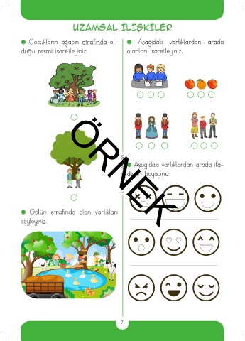 UZAMSAL İLİŞKİLER Çocukların ağacın etrafında ol- Aşağıdaki varlıklardan arada duğu resmi işaretleyiniz. olanları işaretleyiniz. Aşağıdaki varlıklardan arada ifa- deleri boyayınız. pekşen yayınları ÖRNEK Gölün etrafında olan varlıkları söyleyiniz. 7