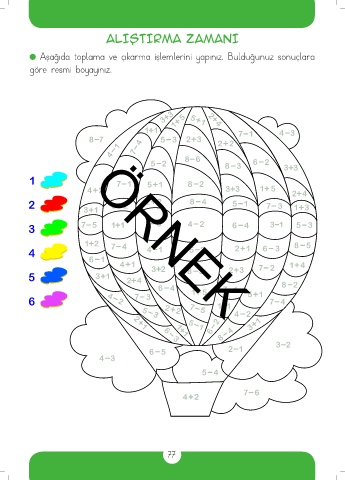 ALIŞTIRMA ZAMANI Aşağıda toplama ve çıkarma işlemlerini yapınız. Bulduğunuz sonuçlara Aşağıda toplama ve çıkarma işlemlerini yapınız. Bulduğunuz sonuçlara göre resmi boyayınız. göre resmi boyayınız. ÖRNEK 77