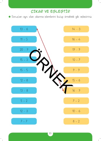 ÇIKAR VE EŞLEŞTİR Sonuçları aynı olan çıkarma işlemlerini bulup örnekteki gibi eşleştiriniz. 13 - 6 14 - 3 11 - 5 16 - 4 20 - 9 19 - 9 15 - 3 10 - 7 15 - 5 9 - 9 12 - 8 15 - 6 ÖRNEK 13 - 8 16 - 9 5 - 2 7 - 2 12 - 3 10 - 6 7 - 7 8 - 2 79