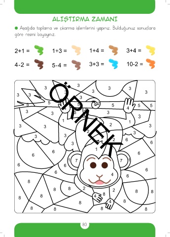ALIŞTIRMA ZAMANI Aşağıda toplama ve çıkarma işlemlerini yapınız. Bulduğunuz sonuçlara göre resmi boyayınız. ÖRNEK 80