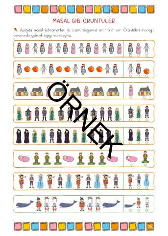MASAL GİBİ ÖRÜNTÜLER Aşağıda masal kahramanları ile oluşturduğumuz örüntüler var. Örüntüleri inceleyip devamında gelecek ögeyi işaretleyiniz. ÖRNEK 116