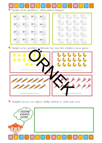 Aşağıda verilen görsellerin 1 düzine kadarını boyayınız. Aşağıda verilen görsellerin 1 düzineden kaç tane fazla olduklarını bulup yazınız. ÖRNEK Aşağıdaki kutunun içine Ayla’nın istediği miktarda ve renkte çiçek çiziniz. 13