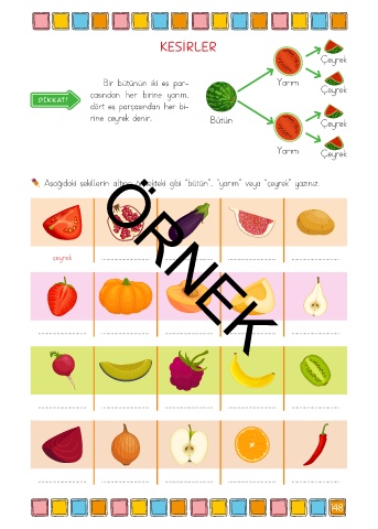Aşağıdaki şekillerin altına örnekteki gibi “bütün”, “yarım” veya “çeyrek” yazınız.