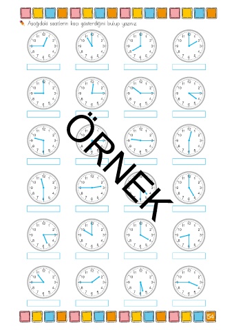 Aşağıdaki saatlerin kaçı gösterdiğini bulup yazınız. 6:15 4:15 11:00 11:45 12:15 5:00 7:00 4:45 7:30 9:30 6:00 4:30 ÖRNEK 1:45 2:00 8:45 2:45 5:30 5:15 10:00 7:45 3:15 10:30 10:15 9:45 154