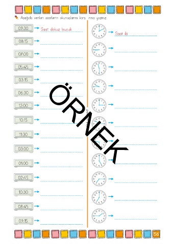 Aşağıda verilen saatlerin okunuşlarını karşılarına yazınız. 09:30 Saat dokuz buçuk Saat iki 08:15 07:00 05:45 03:15 12:00 10:15 pekşen yayınları 11:30 06:30 ÖRNEK 03:00 01:00 02:45 10:30 08:45 09:15 156
