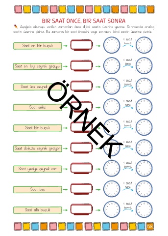 saatin üzerine çiziniz. Bu zamanın bir saat öncesini veya sonrasını ikinci saatin üzerine çiziniz.
