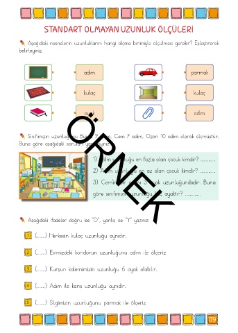 Sınıfımızın uzunluğunu Büşra 9 adım, Cem 7 adım, Ozan 10 adım olarak ölçmüştür.