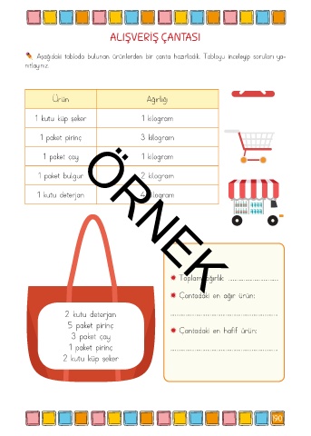 Aşağıdaki tabloda bulunan ürünlerden bir çanta hazırladık. Tabloyu inceleyip soruları ya-