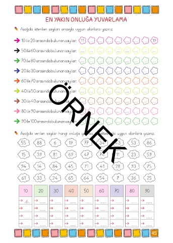 Aşağıda verilen sayılar hangi onluğa yakınsa örnekteki gibi uygun alanlara yazınız.