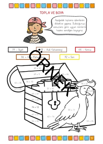 TOPLA VE BOYA Aşağıdaki toplama işlemlerini dikkatlice yapınız. Bulduğunuz sonuçlara göre uygun renklerle hazine sandığını boyayınız. 99 = Siyah 78 = Açık Kahverengi 66 = Kırmızı 86 = Koyu Kahverengi 92 = Sarı ÖRNEK 51