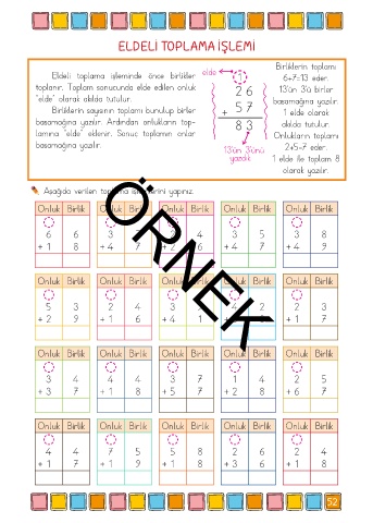 lamına “elde” eklenir. Sonuç toplamın onlar Onlukların toplamı