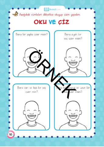 ilkokul1.com Aşağıdaki cümleleri dikkatlice okuyup çizim yapalım. OKU VE ÇİZ Bana bir şapka çızer misin? Bana siyah bir saç çızer misin? Bana sarı ve kısa bir saç Bana kahverengi ve uzun bir ÖRNEK çızer miin? saç çızer misin? 16