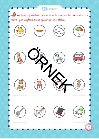 ilkokul1.com Aşağıdaki görsellerin isimlerini altlarına yazalım. Ardından ay- nılarını yan sayfada bulup yuvarlak içine alalım. ÖRNEK 7