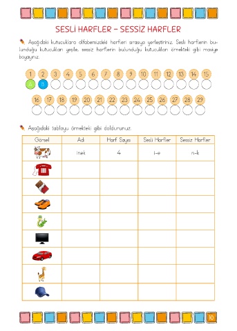lunduğu kutucukları yeşile, sessiz harflerin bulunduğu kutucukları örnekteki gibi maviye