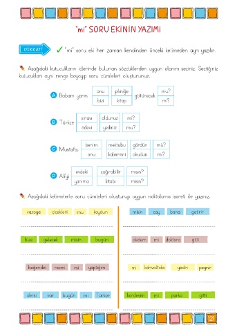 kutucukları aynı renge boyayıp soru cümleleri oluşturunuz.