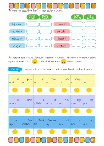 Aşağıda satır sonuna sığmayan sözcükler verilmiştir. Sözcüklerden hecelerine doğru
