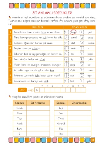 Yuvarlak içine aldığınız sözcüğün başındaki harfleri şifre kutusuna yazıp gizli şifreyi çözü-
