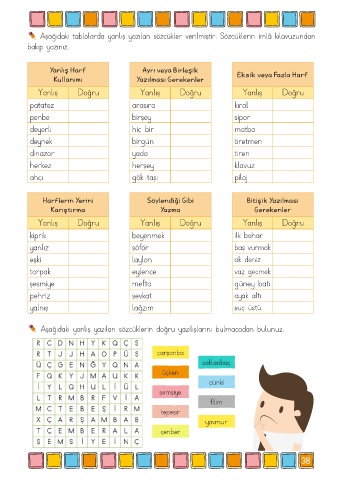 Aşağıdaki yanlış yazılan sözcüklerin doğru yazılışlarını bulmacadan bulunuz.