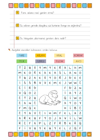 4 Fare, aslana nasıl yardım etmiş? 5 Siz aslanın yerinde olsaydınız sizi kurtaran fareye ne söylerdiniz? 6 Bu hikayeden çıkarmamız gereken ders nedir? Aşağıdaki sözcükleri bulmacanın içinden bulunuz. FARE ASLAN KRAL KORKAK İYİLİK UYKU TUZAK AVCI 46