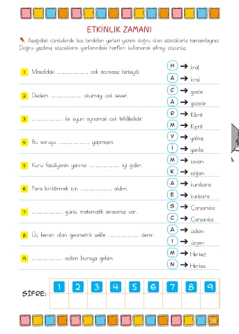 Doğru yazılmış sözcüklerin yanlarındaki harfleri kullanarak şifreyi çözünüz.