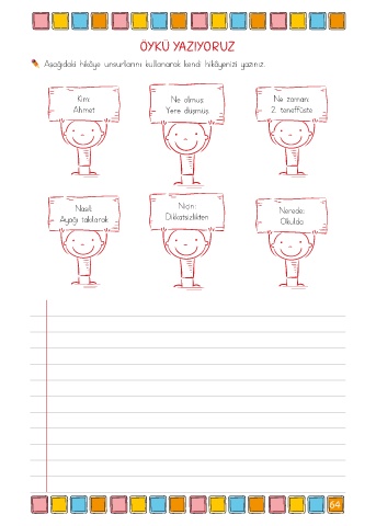 ÖYKÜ YAZIYORUZ Aşağıdaki hikâye unsurlarını kullanarak kendi hikâyenizi yazınız. Kim: Ne olmuş: Ne zaman: Ahmet Yere düşmüş. 2. teneffüste Nasıl: Niçin: Nerede: Ayağı takılarak Dikkatsizlikten Okulda 64