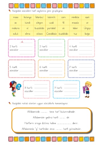 Aşağıdaki sözcükleri harf sayılarına göre gruplayınız.