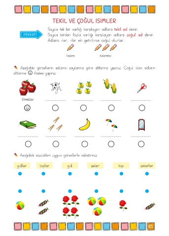 Aşağıdaki görsellerin adlarını sayılarına göre altlarına yazınız. Çoğul olan adların