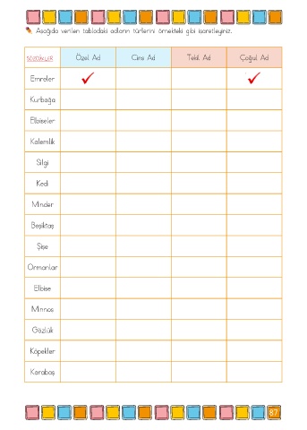 Aşağıda verilen tablodaki adların türlerini örnekteki gibi işaretleyiniz. Özel Ad Cins Ad Tekil Ad Çoğul Ad SÖZCÜKLER Emreler Kurbağa Elbiseler Kalemlik Silgi Kedi Minder Beşiktaş Şişe Ormanlar Elbise Minnoş Gözlük Köpekler Karabaş 87