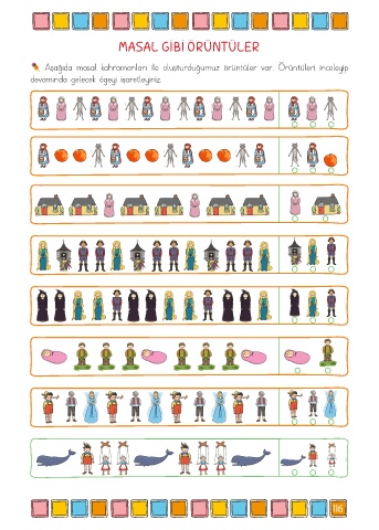 MASAL GİBİ ÖRÜNTÜLER Aşağıda masal kahramanları ile oluşturduğumuz örüntüler var. Örüntüleri inceleyip devamında gelecek ögeyi işaretleyiniz. 116