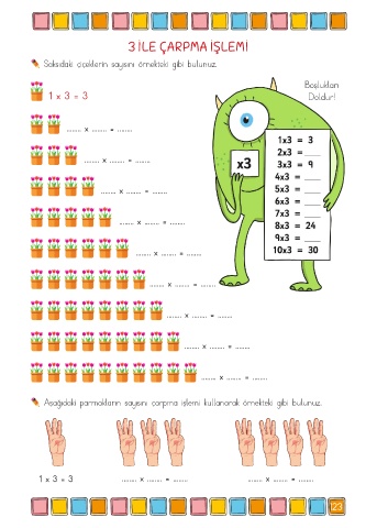 Aşağıdaki parmakların sayısını çarpma işlemi kullanarak örnekteki gibi bulunuz.