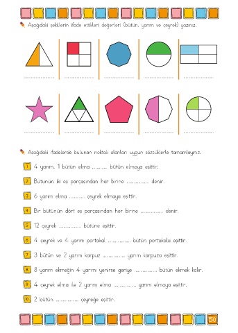 Aşağıdaki şekillerin ifade ettikleri değerleri (bütün, yarım ve çeyrek) yazınız.