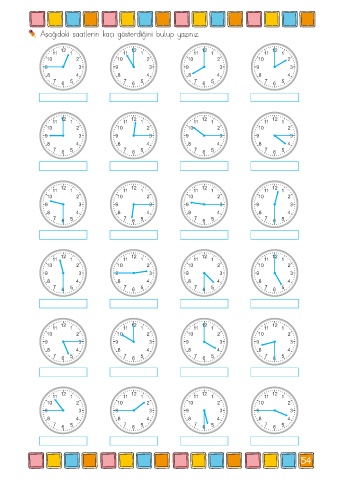 Aşağıdaki saatlerin kaçı gösterdiğini bulup yazınız. 6:15 4:15 11:00 11:45 12:15 5:00 7:00 4:45 7:30 9:30 6:00 4:30 1:45 2:00 8:45 2:45 5:30 5:15 10:00 7:45 3:15 10:30 10:15 9:45 154