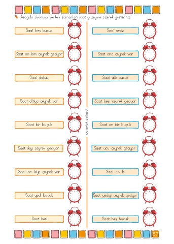 Aşağıda okunuşu verilen zamanları saat yüzeyine çizerek gösteriniz.