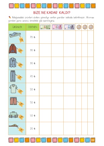 BİZE NE KADAR KALDI? Mağazadaki ürünleri alırken görevliye verilen paralar tabloda belirtilmiştir. Alınması gereken para üstünü örnekteki gibi işaretleyiniz. ÜRÜNLER ÖDENEN 70 58 72 90 90 89 70 64 50 25 50 19 50 43 20 6 168