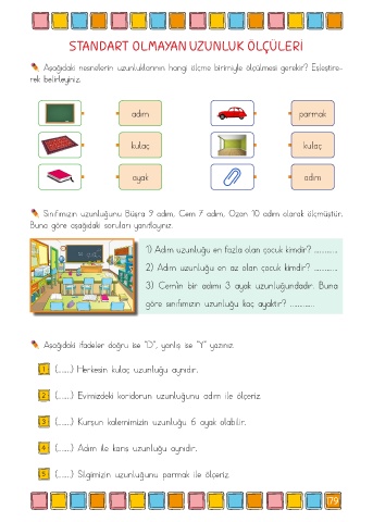 Sınıfımızın uzunluğunu Büşra 9 adım, Cem 7 adım, Ozan 10 adım olarak ölçmüştür.