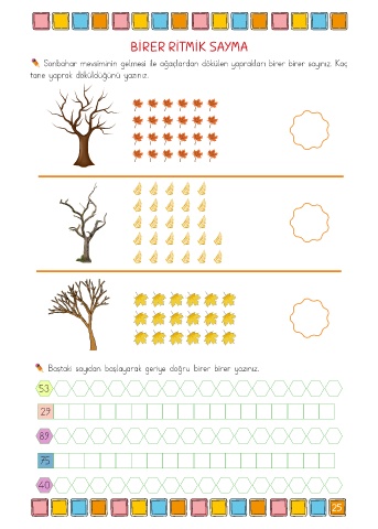 BİRER RİTMİK SAYMA Sonbahar mevsiminin gelmesi ile ağaçlardan dökülen yaprakları birer birer sayınız. Kaç tane yaprak döküldüğünü yazınız. Baştaki sayıdan başlayarak geriye doğru birer birer yazınız. 53 29 89 75 40 25