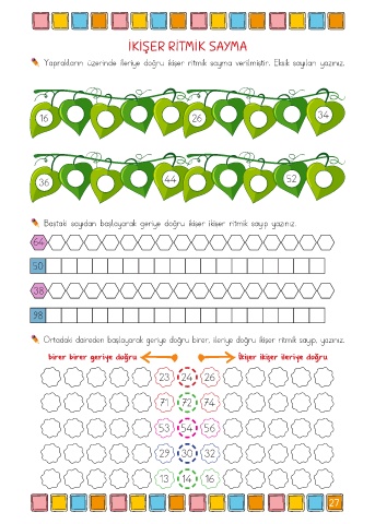Yaprakların üzerinde ileriye doğru ikişer ritmik sayma verilmiştir. Eksik sayıları yazınız.
