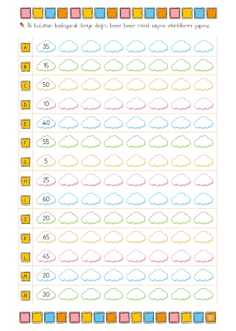 İlk buluttan başlayarak ileriye doğru beşer beşer ritmik sayma etkinliklerini yapınız. A 35 B 15 C 50 D 10 E 40 F 55 G 5 H 25 İ 60 J 20 K 65 L 45 M 20 N 30 30