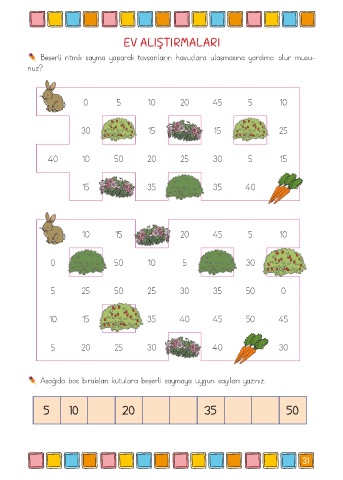EV ALIŞTIRMALARI Beşerli ritmik sayma yaparak tavşanların havuçlara ulaşmasına yardımcı olur musu- nuz? Aşağıda boş bırakılan kutulara beşerli saymaya uygun sayıları yazınız. 5 10 20 35 50 31