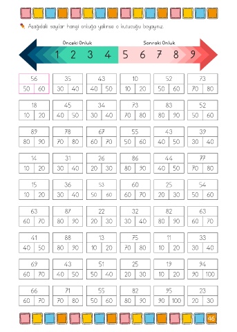 Aşağıdaki sayılar hangi onluğa yakınsa o kutucuğu boyayınız.