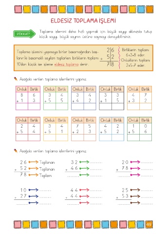 10’dan küçük ise işleme eldesiz toplama denir. 78 2+5=7 eder.