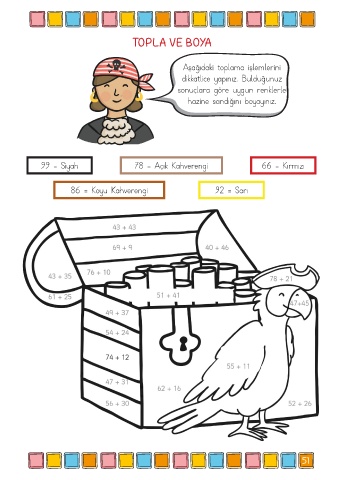 TOPLA VE BOYA Aşağıdaki toplama işlemlerini dikkatlice yapınız. Bulduğunuz sonuçlara göre uygun renklerle hazine sandığını boyayınız. 99 = Siyah 78 = Açık Kahverengi 66 = Kırmızı 86 = Koyu Kahverengi 92 = Sarı 51