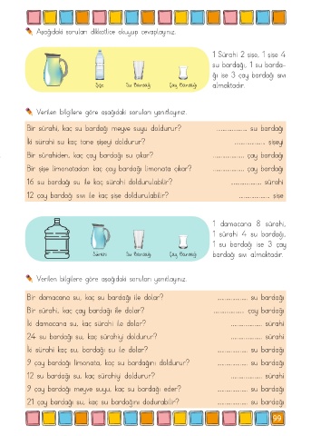 Şişelerin tamamında su miktarı birbirine eşittir. 16 su bardağı su ile kaç sürahi doldurulabilir? .................... sürahi