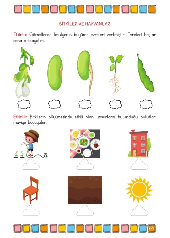 BİTKİLER VE HAYVANLAR Etkinlik: Görsellerde fasulyenin büyüme evreleri verilmiştir. Evreleri baştan sona sıralayalım. Etkinlik: Bitkilerin büyümesinde etkili olan unsurların bulunduğu bulutları maviye boyayalım. 104