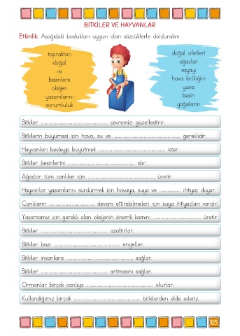 BİTKİLER VE HAYVANLAR Etkinlik: Aşağıdaki boşlukları uygun olan sözcüklerle dolduralım. topraktan doğal afetleri doğal ağaçlar ısı eşyayı besinlere hava kirliliğini oksijen yuva yaşamlarını besin sorumluluk yağışların 105