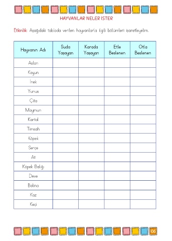 Etkinlik: Aşağıdaki tabloda verilen hayvanlarla ilgili bölümleri işaretleyelim.